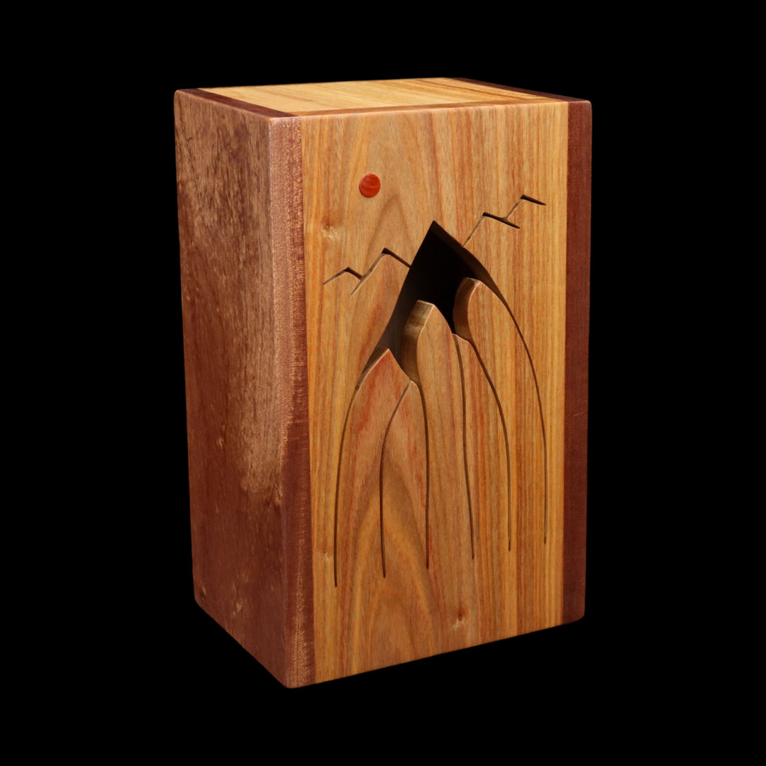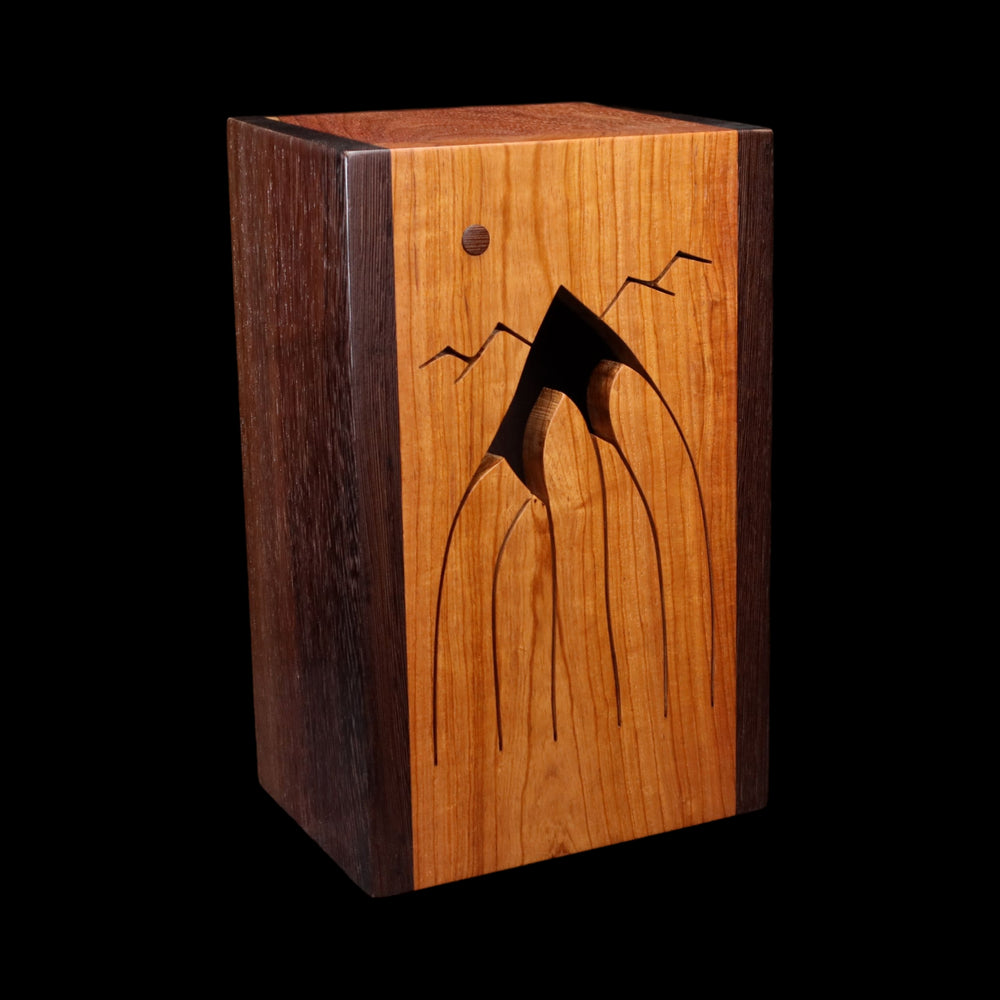 The visual design of this instrument is an homage to the San Francisco Peaks above our hometown of Flagstaff, Arizona. Many prefer to display their Peaks drums on-end when they aren’t playing them, so as to showcase the mountain landscape with moon flying above.